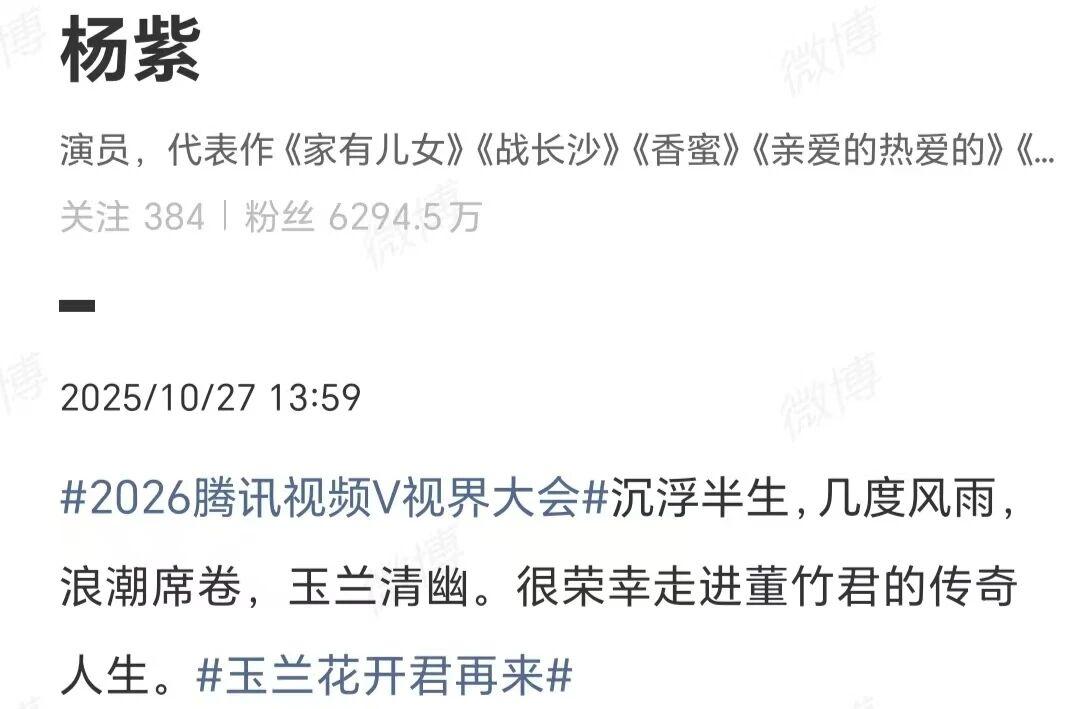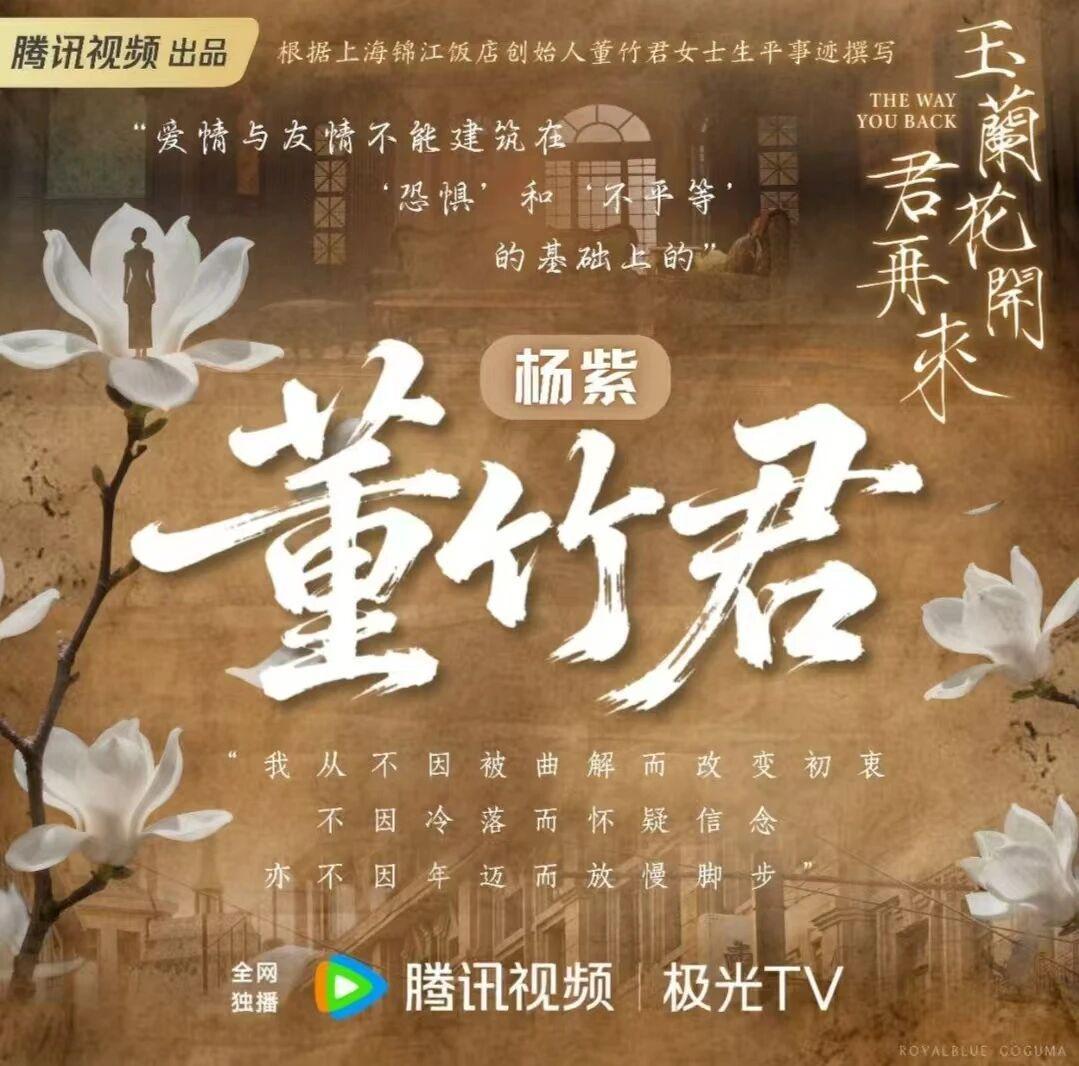 10月27日,由腾讯视频、晟喜华视出品,金色传媒联合出品的年代女性传奇剧《玉兰花开君再来》正式官宣,演员杨紫确认出演传奇大女主董竹君。消息发布后,杨紫在社交平台发文:“沉浮半生,几度风雨,浪潮席卷,玉兰清幽。很荣幸走进董竹君的传奇人生。”