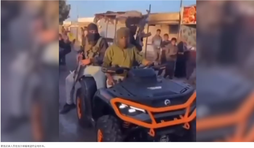 最近在TikTok上流传的一段视频中,可以看到哈马斯恐怖分子骑着一辆由卡车拖着的偷来的全地形车。这段视频展示了小偷能够轻松地将全地形车走私过境,甚至武装恐怖分子还驾驶偷来的全地形车从联合国车辆旁边驶过。