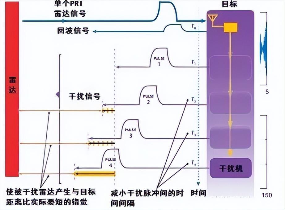 而后,根据我方想让敌方探测的预设假目标相对位置,计算信号延迟时间,通过数字信号处理,在存储信号中插入对应时间间隔,实现假目标距离欺骗。