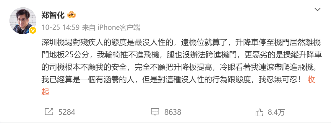 回顾事件发酵过程:10月25日,郑智化发文指责深圳机场“对残疾人态度没人性”,称升降车与机门存在25公分高度差,导致其需“连滚带爬”登机。深圳机场随即回应,解释高度差源于安全规范及设备限制,并公布监控视频还原现场。