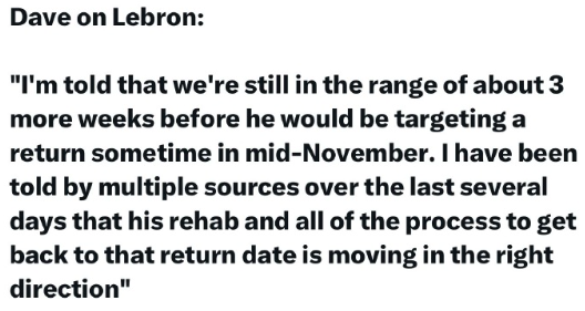Dave McMenamin表示:“根据多方消息源确认,詹姆斯仍需约三周时间进行康复,预计将在11月中旬的某个时间点重返赛场。过去几天,所有关于他伤情恢复和复出准备的流程都在按计划推进,方向非常明确。”