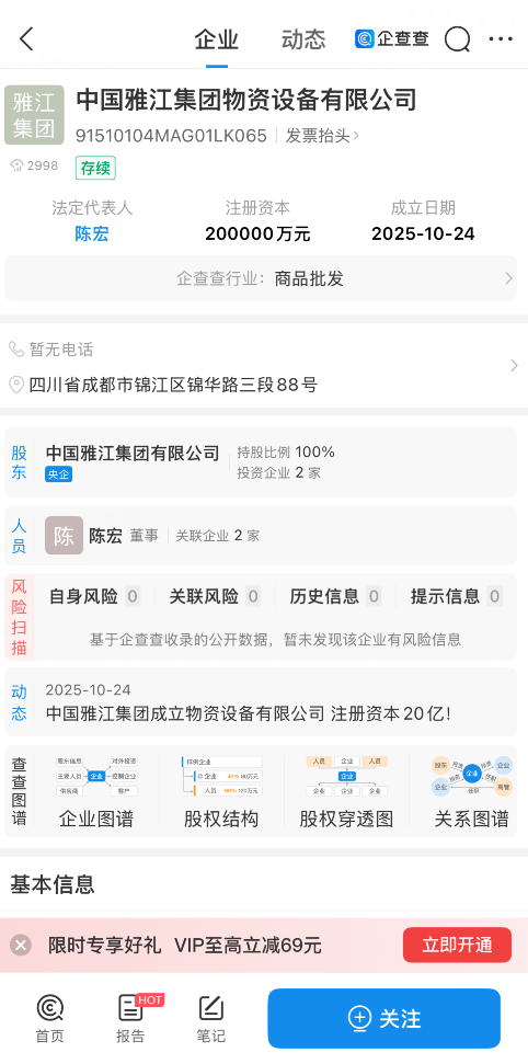 据工商注册信息显示,10月22日,中国雅江集团有限公司成都分公司正式注册成立,注册地址位于成都市锦江区锦江大道1666号。紧接着,10月24日,中国雅江集团物资设备有限公司、中国雅江集团招标有限公司也相继在成都市锦江区锦华路三段88号注册成立。