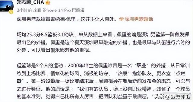 尽管数据亮眼,但佩里在深圳男篮效力期间曾引发多次争议。球队主帅周鹏公开批评其职业态度,指出该球员存在单打过多、防守注意力不集中等问题,甚至在更衣室出现情绪失控现象。深圳男篮跟队记者郑志鹏曾撰文评价:“从日常训练到正式比赛,佩里都表现出明显的情绪化特征,消极防守、频繁抱怨队友等行为,严重影响了团队凝聚力。”