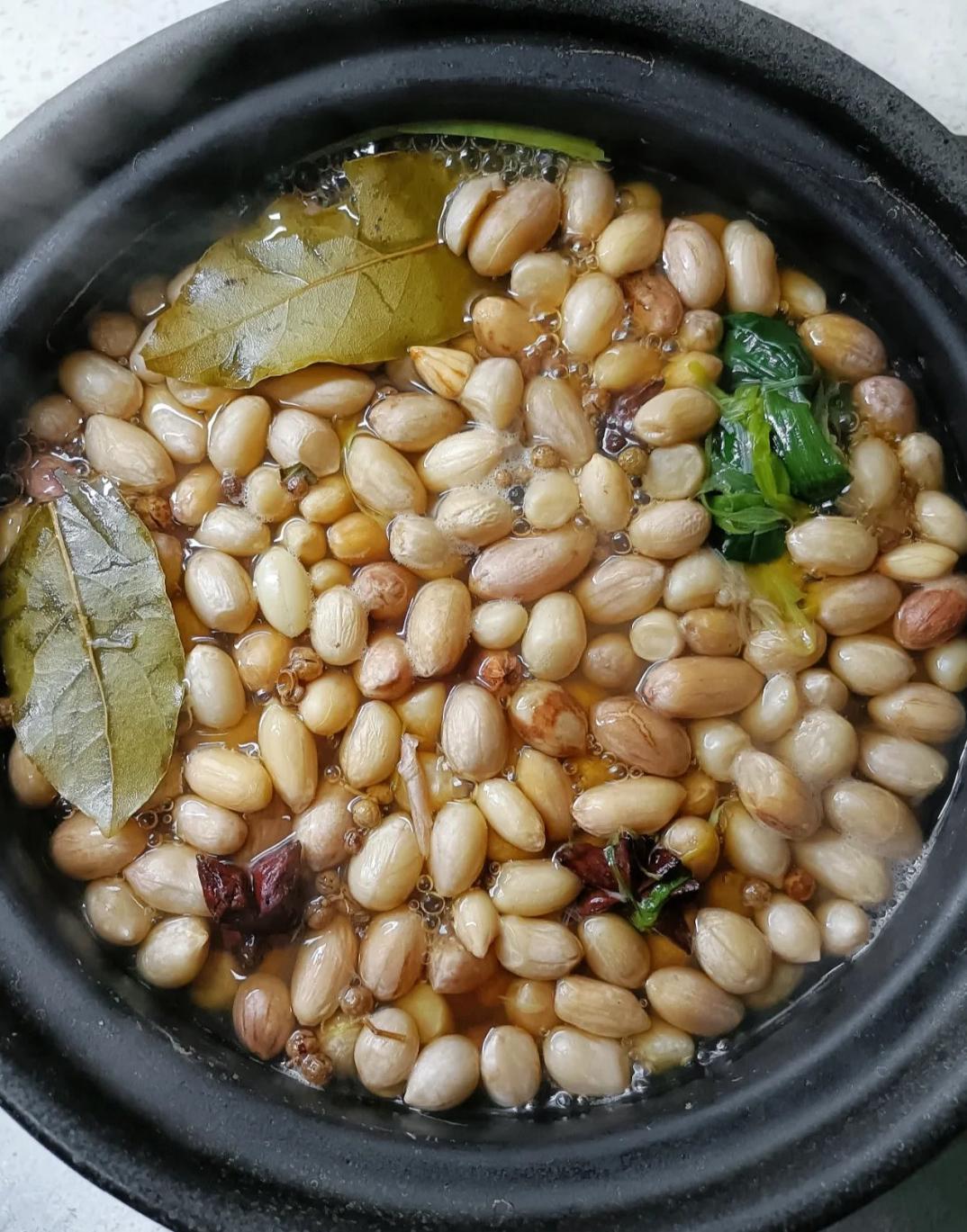 做这道菜,需提前将花生米用清水泡4个小时,泡到花生米鼓起来,这样煮时更容易入味,还不会煮碎。泡好后洗净,放入锅中,加足量清水(水量没过花生米两指),再放八角、桂皮、香叶、少许花椒,加盐和老抽(盐要比平时炒菜多放一点)。大火烧开后转小火,煮20分钟后关火,让花生米在汤里泡到汤汁变凉,这样味道才能全吸进去。花生米虽好,一次不能吃太多,每天吃一小把刚刚好。
