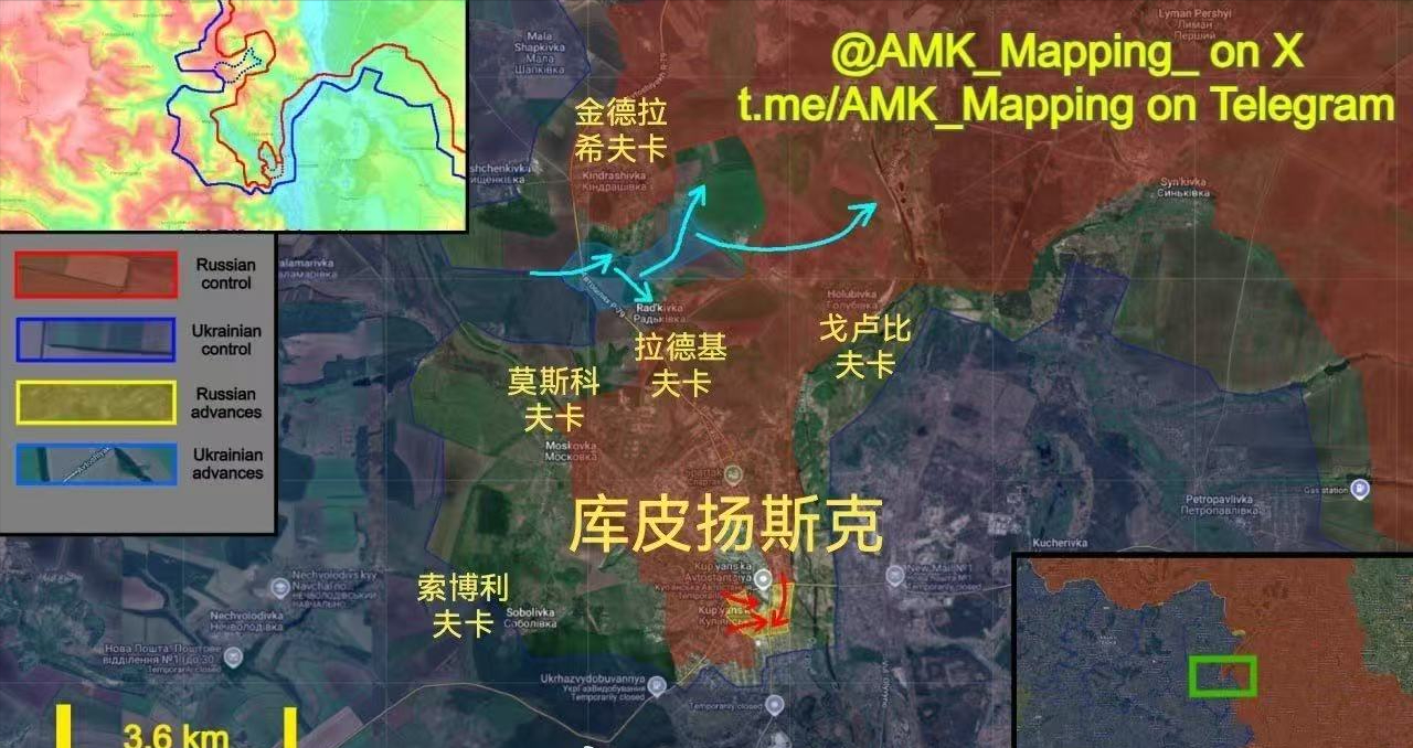 库皮扬斯克方向,俄乌两军均有推进,乌克兰军队正试图从北部切断市区内俄军的后路。过去几天,乌军从新收复的莫斯科夫卡北部森林种植园出发,穿过P-79公路,进入金德拉希夫卡南部和拉德基夫卡西北部的森林,并进一步向金德拉希夫卡东南和东部的林线推进。与此同时,俄军继续在库城市区渗透,已出现在市中心的居民区和大学里。