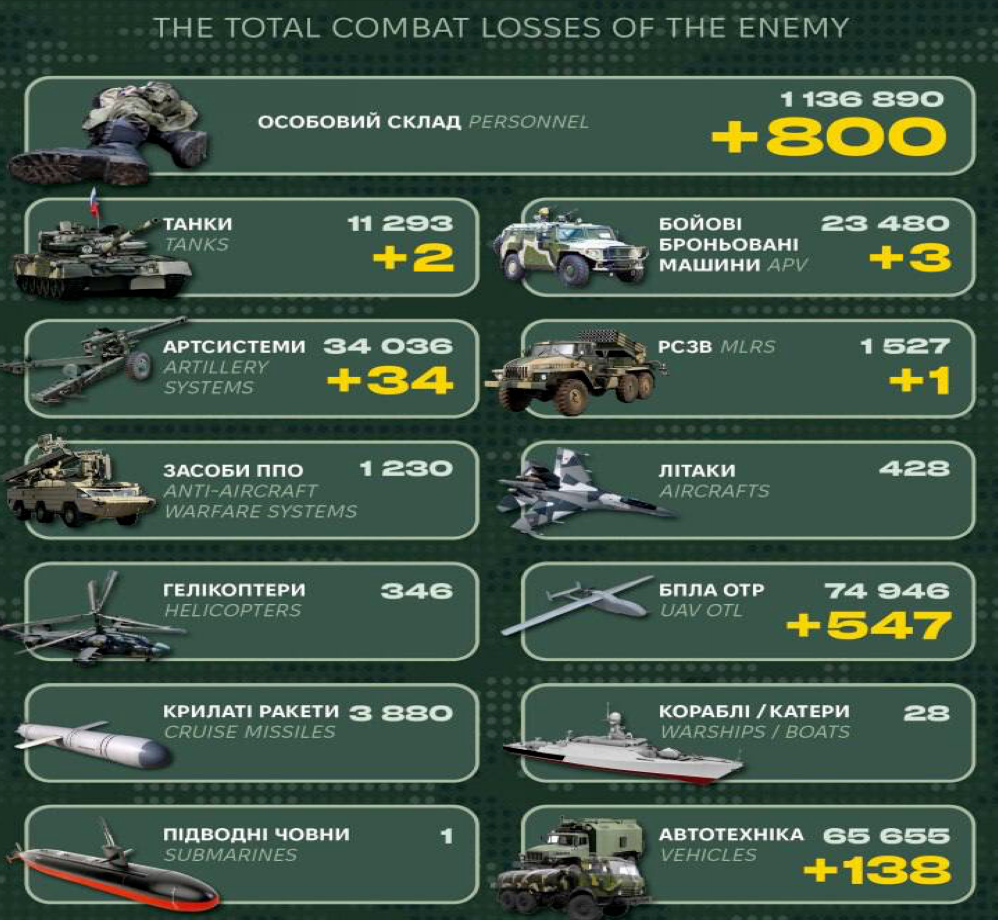 乌克兰武装部队总参谋部公布的昨日战果显示,乌军歼敌(毙+伤)800人。乌总参在公布战果时配文说:“有时候人们不想听到真相,是因为不想自己的幻想破灭。”这话既是说给克里姆林宫听的,也是说给那些不相信俄军损失惨重的人听的。
