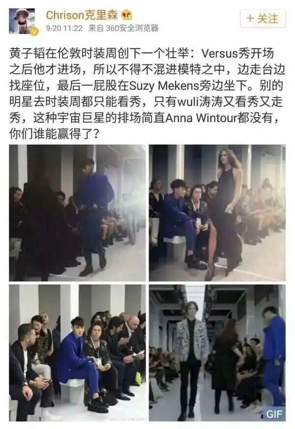 没过多久,他又在伦敦时装周闹下笑话。看秀迟到怎么办?wuli韬韬想到了绝佳办法,那就是混进模特队伍。黄子韬在T台上边走边提着裤子的松紧带,最后一屁股坐在著名时尚评论人Suzy Mekens旁边,看得suzy目瞪口呆。