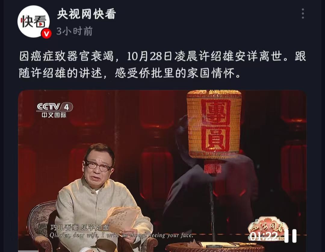 就在其家人公布许绍雄逝世后不久,央视网就特意转发了一段他生前朗诵侨批的视频: