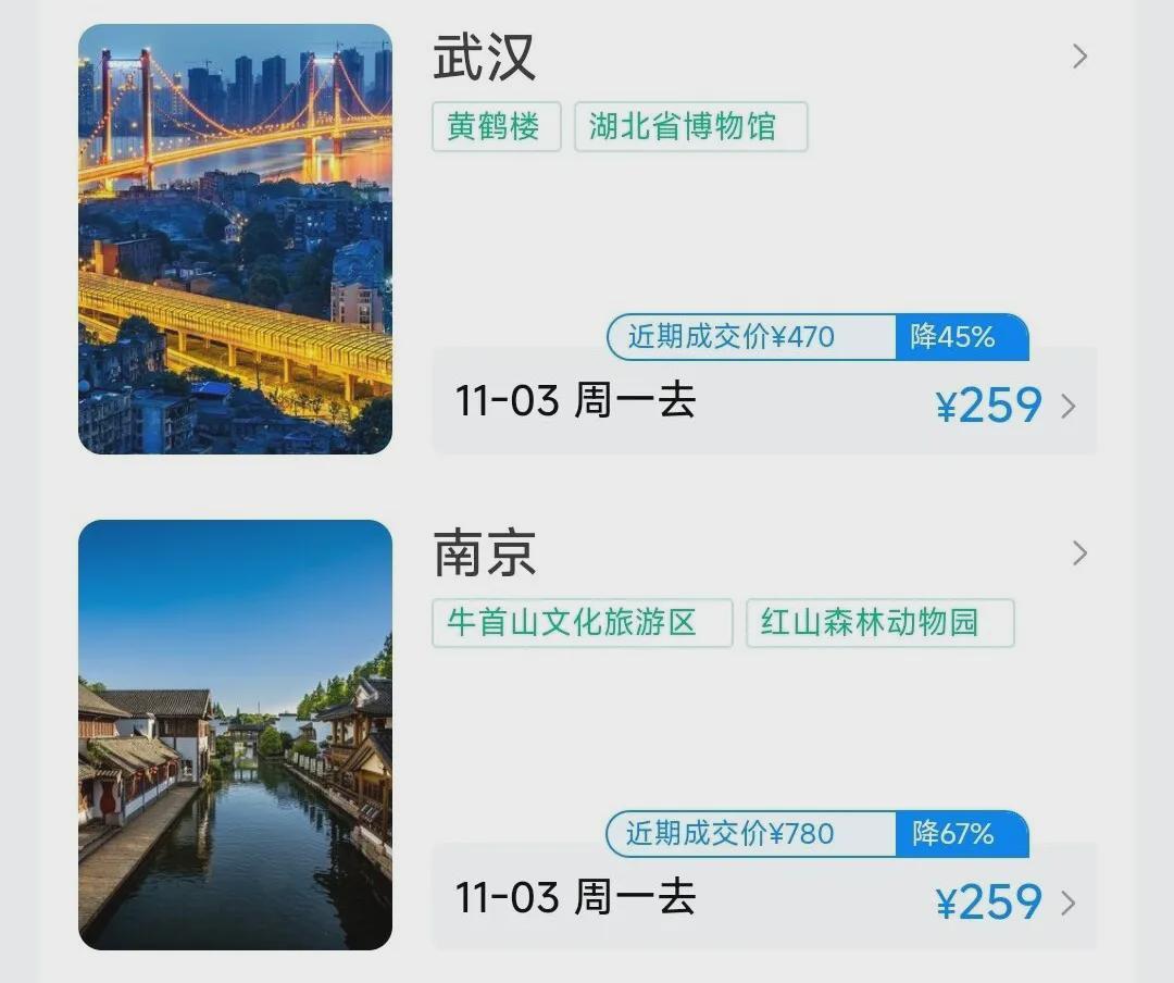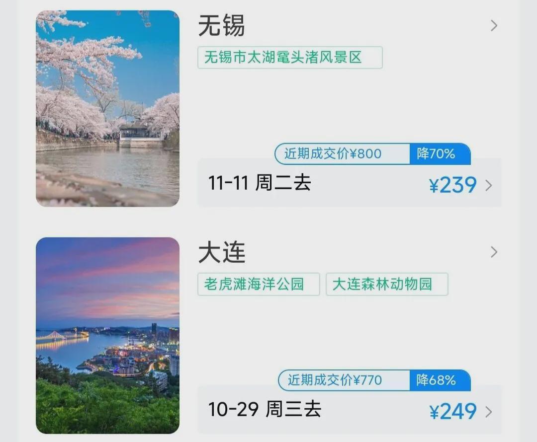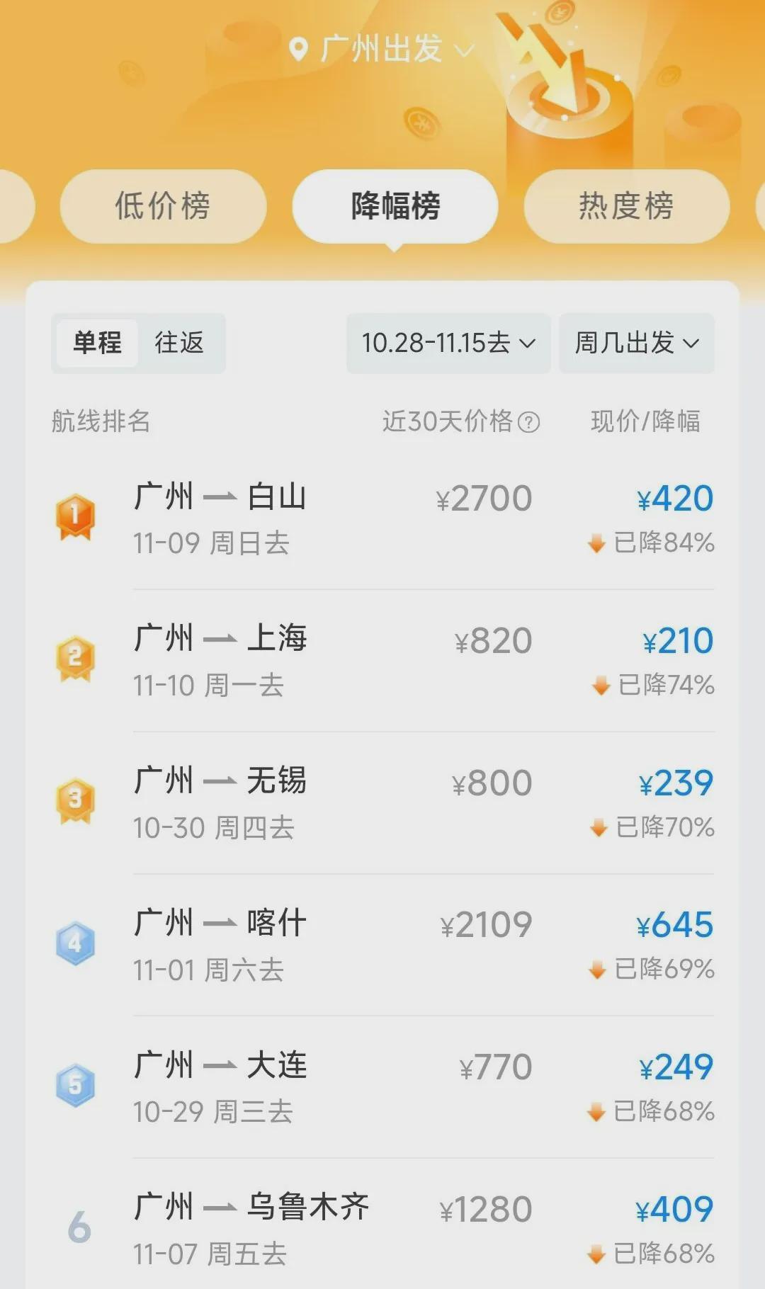近期,机票、酒店价格普遍“降温”,适合“捡漏”错峰出游。小编通过查询第三方售票平台发现,十月下旬至十一月,广州出发前往上海、无锡、大连、武汉、南京等地的机票价格大幅下降,最高降幅达84%,不少航线价格低至1-2折,正是错峰出游的好时机。