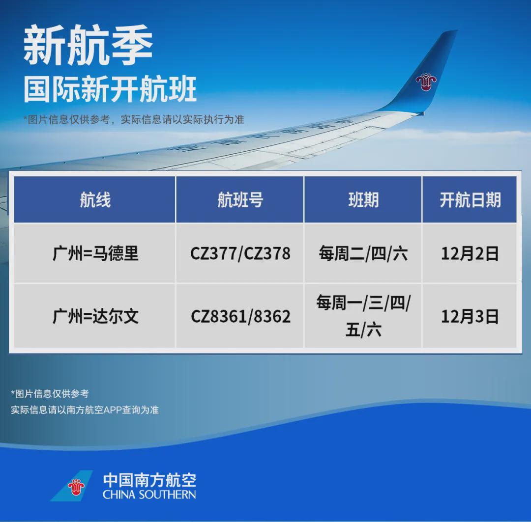 国际及地区方面,南航计划于12月2日起新开广州-马德里、12月3日起新开广州⇌达尔文国际长航线。为应对澳大利亚旅游旺季,南航计划于11月29日起复航广州至珀斯直飞航线,11月30日起复航广州至阿德莱德直飞航线,并在悉尼、布里斯班等航线增加近160个往返航班。