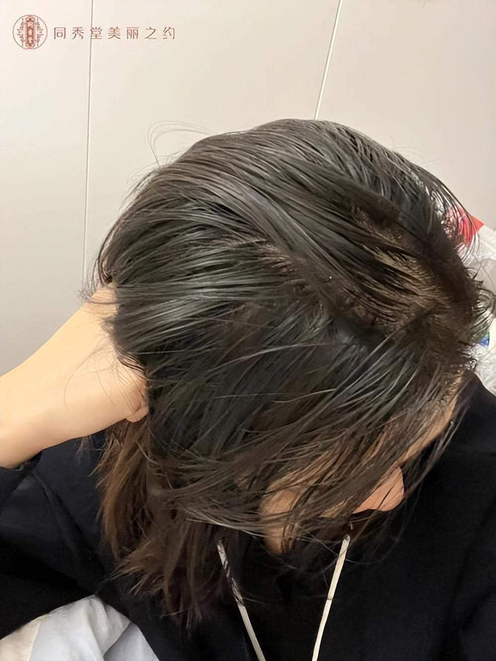 而且还让人好奇的是,现在的头发一点光泽都没有,甚至软趴趴地贴在头皮上,一眼看去还不如假发更有光泽呢。