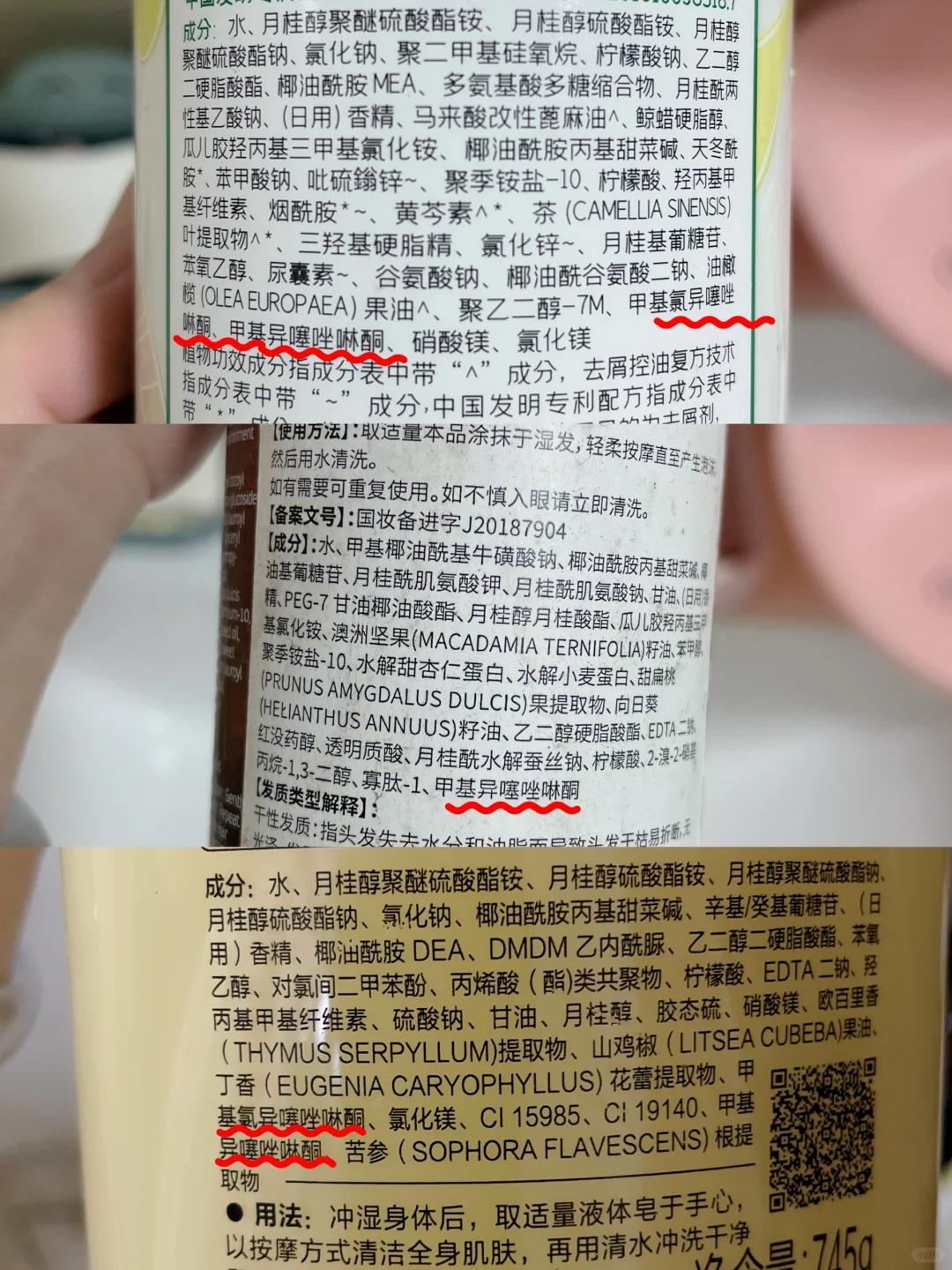 除此之外,还有添加甲基氯异塞唑啉酮、甲基异塞唑啉酮这两种化学物质的洗发水,其实本质上跟月桂醇聚醚硫酸脂钠的效果一样。