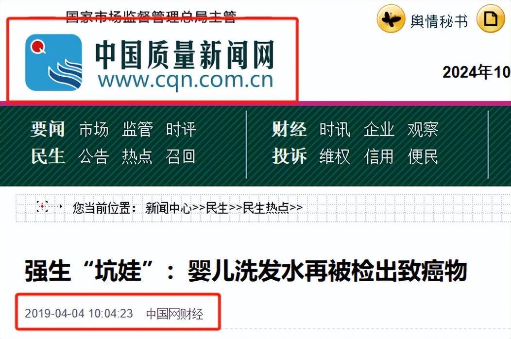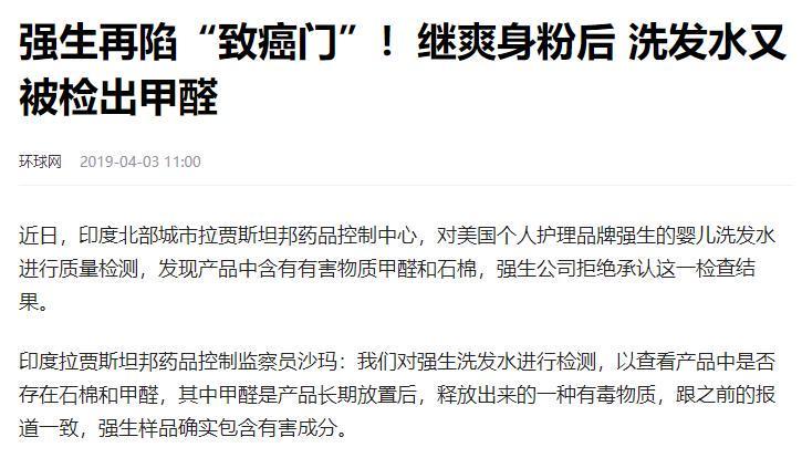 环球网2019年4月3日——强生再陷“致癌门”!继爽身粉后 洗发水又被检出甲醛