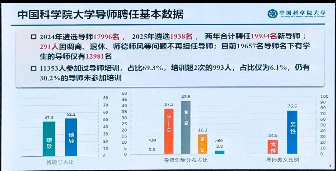 上述数据不仅反映了中国科学院大学导师队伍建设的新动态,也揭示了导师之间的竞争愈发激烈。在学术资源有限的情况下,若不提升自身竞争力,导师可能面临“无生可带”的困境。这一现象也为考研、读博的学生在选择导师时提供了新的参考维度。学生现在有了更多的选择空间,可以更倾向于选择学术能力强、培养资源好的导师。同时,这也对导师提出了更高要求,他们需要在学术水平、师德师风、培养能力等方面不断提升,以吸引更多学生选择。