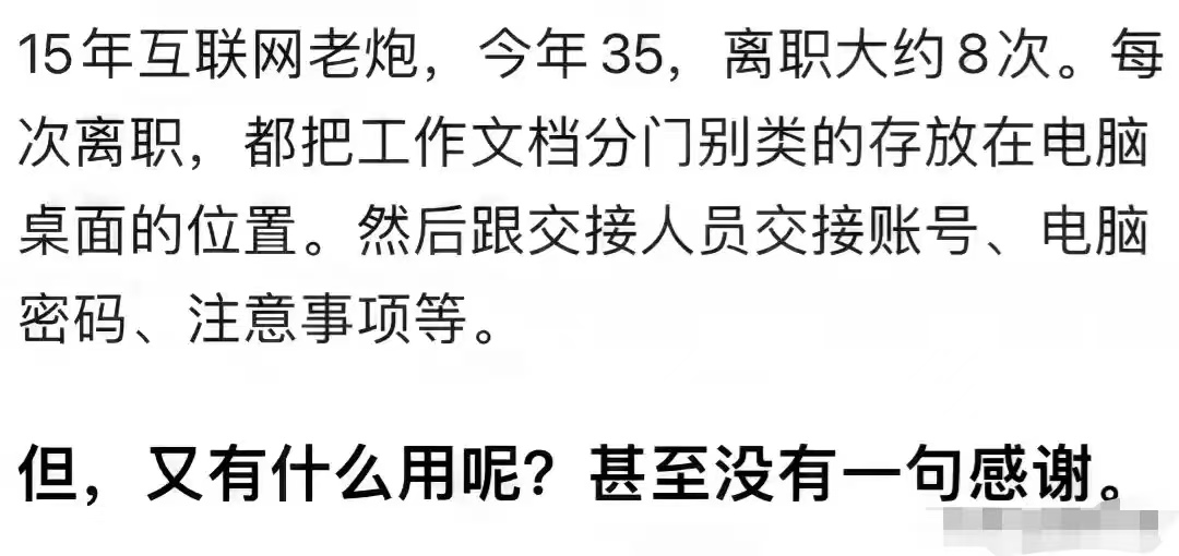互联网老炮离职8次,每次交接都像“学术答辩”,结果连句“谢谢”都没有。不是所有真诚都能换来回响,有些公司的人品,比代码里的bug还难找。