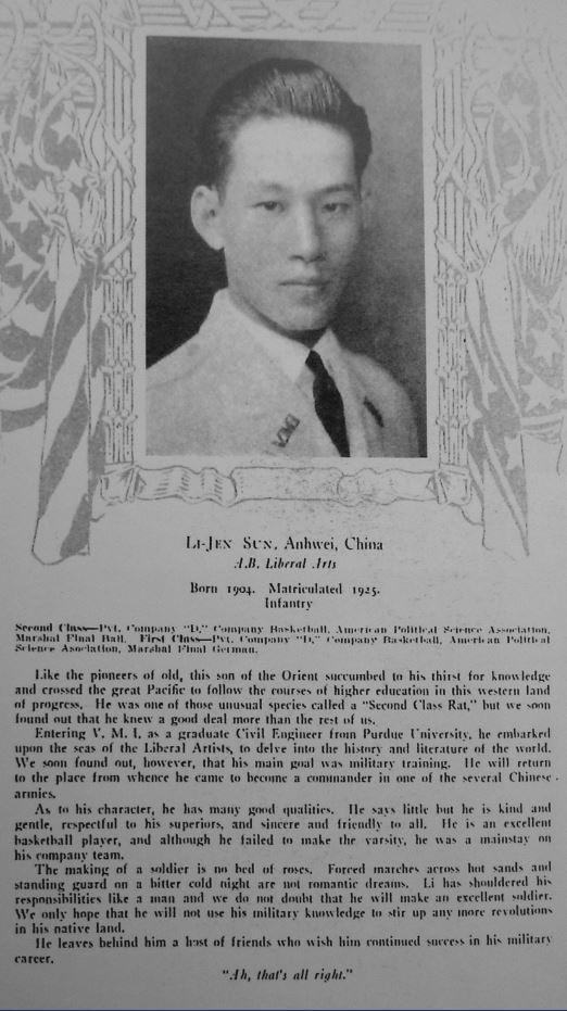 孙立人于美国弗吉利亚军事学院毕业纪念册上的照片及评语