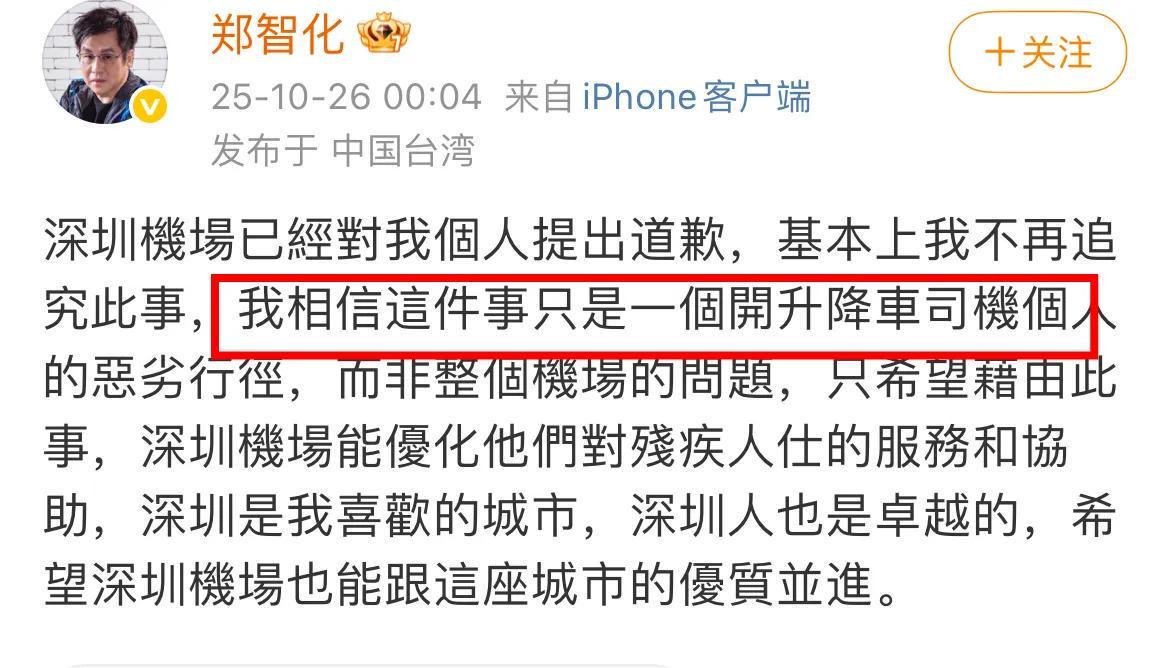 面对郑智化的控诉,深圳机场方面迅速作出了回应,表示了歉意,并承诺会对他的遭遇进行详细核查。然而,郑智化在表示不会追究机场责任的同时,仍坚持认为升降梯司机是故意刁难他,认为这次事件是司机的个人行为。