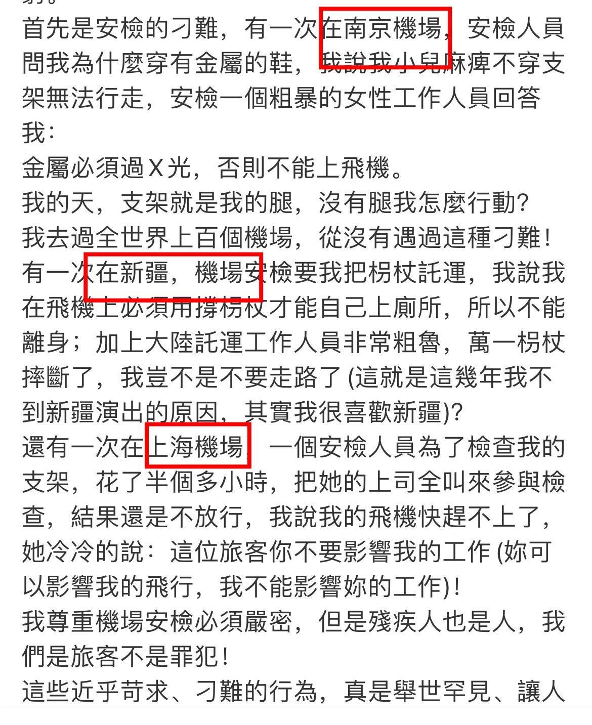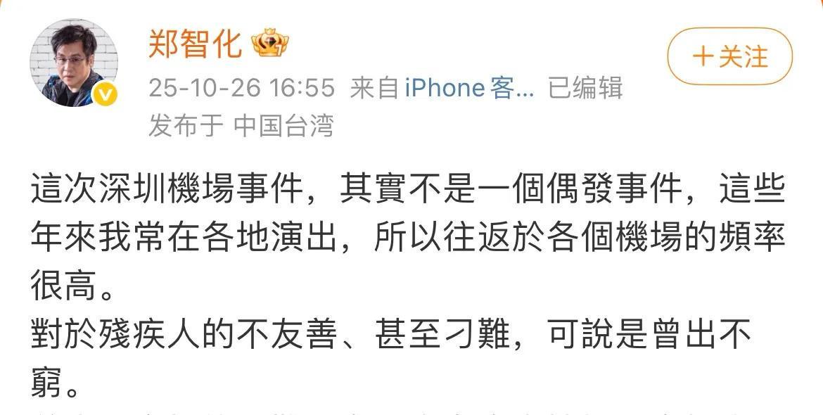 在深圳机场道歉并被郑智化接受后,他似乎仍心存不满,再次发布长篇动态,控诉国内机场对残障人士的服务普遍存在问题。他详细描述了在上海、南京、新疆三个机场的遭遇。