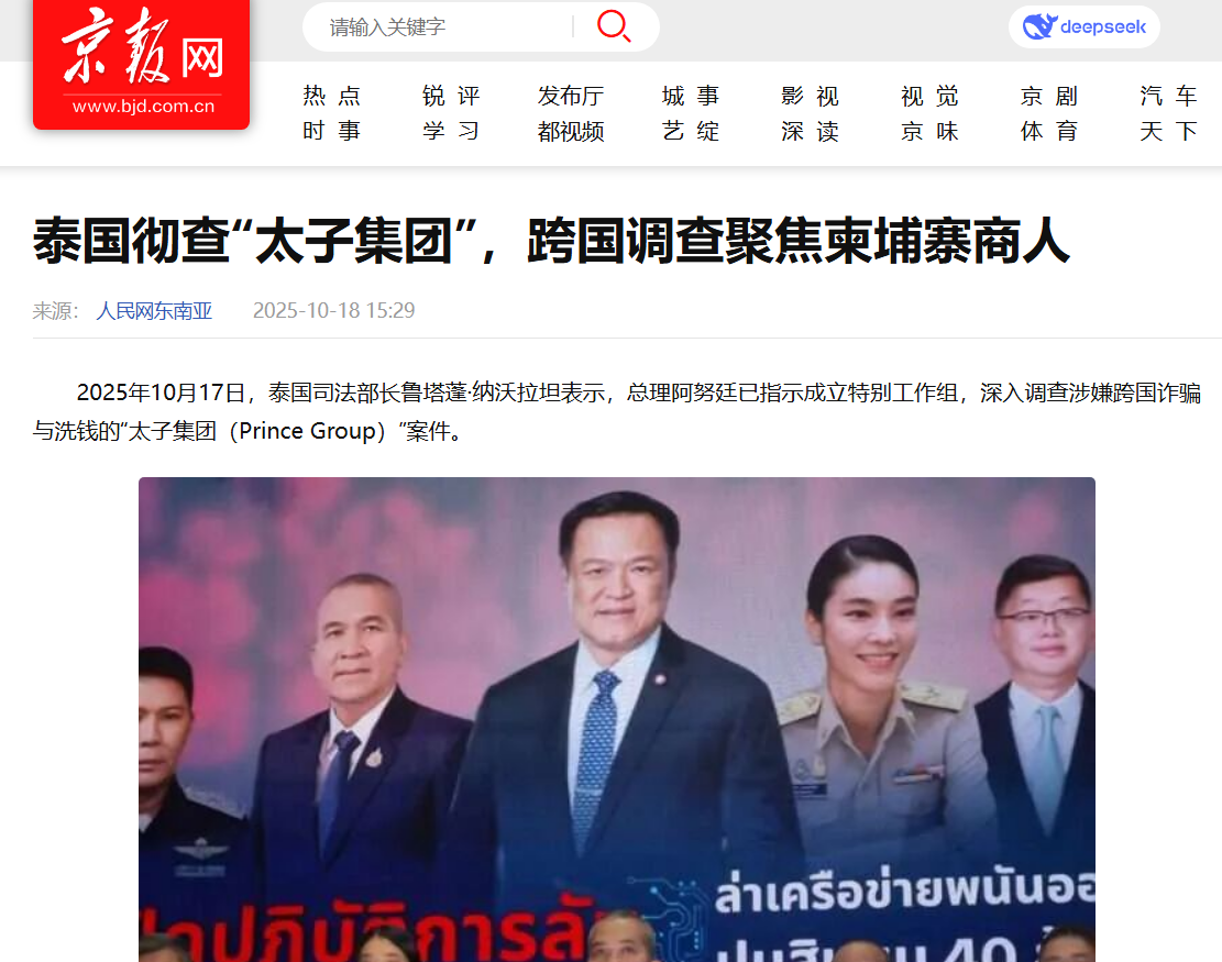 一、京报网报道称,泰国彻查被美英打击的“太子集团”,跨国调查聚焦柬埔寨商人陈志。