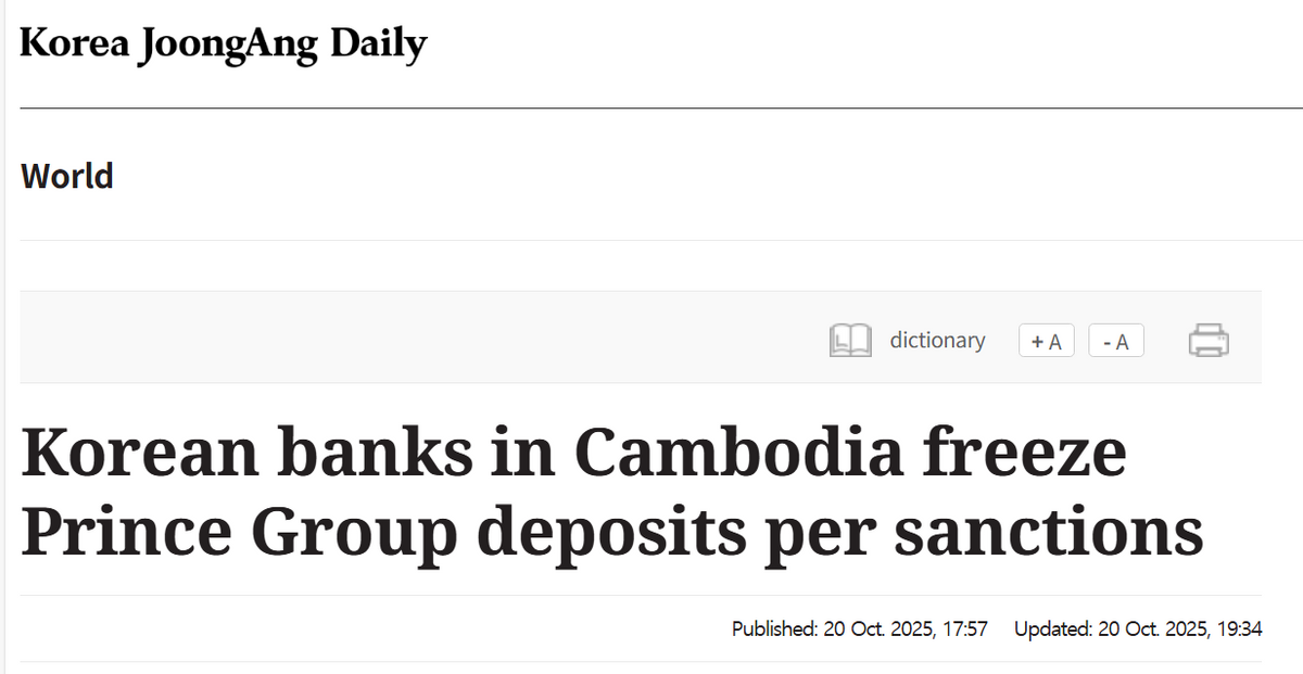 《韩国中央日报》报道称,在太子集团、其所有者和 144 家相关实体受到美国和英国制裁后,太子集团和陈志在韩国人经营的 PPC 银行、KB Prasac 银行、柬埔寨友利银行、柬埔寨新韩银行和 DGB 柬埔寨存放的价值 912 亿韩元(6400 万美元)的定期存款已被冻结。
