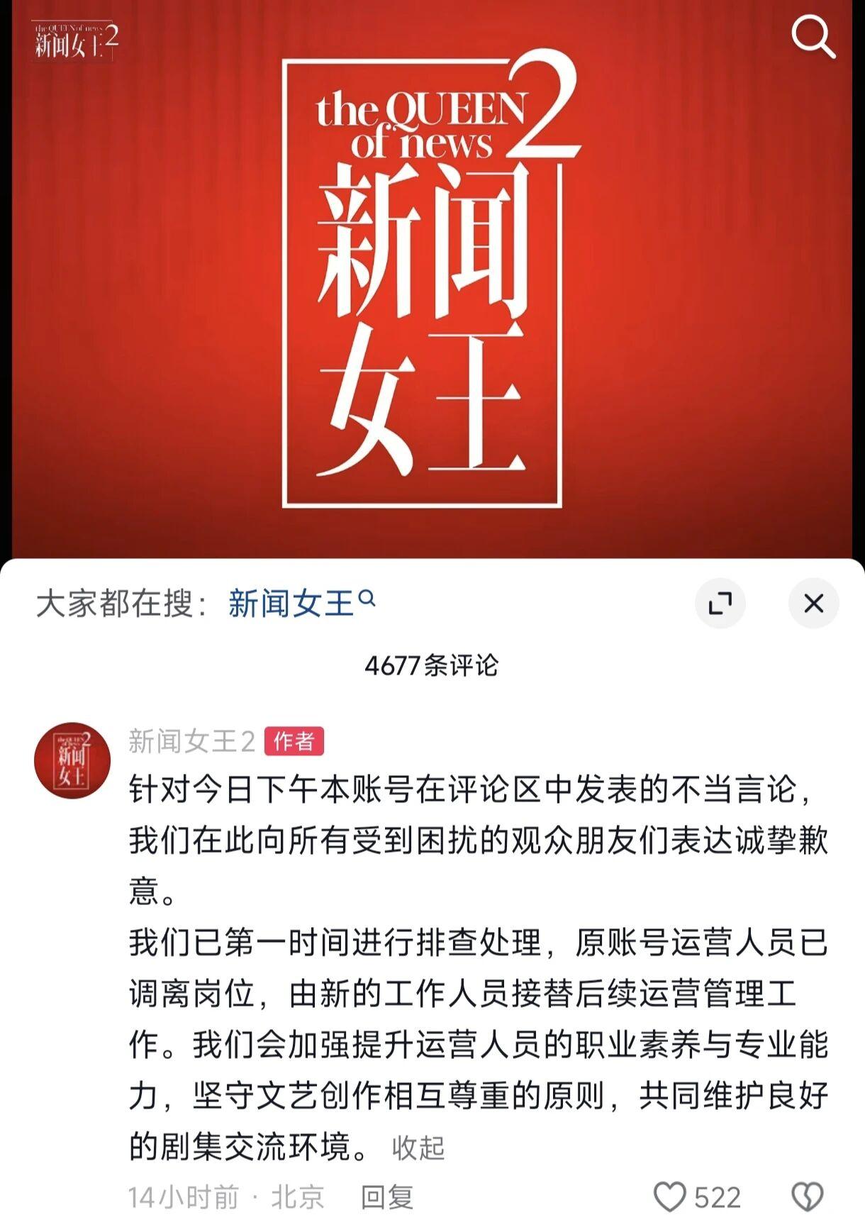面对这一突如其来的争议,《新闻女王2》官方账号迅速反应,紧急发文致歉。官方表示,此前发表的言论确实不当,已经对原账号运营人员进行了调岗处理,后续工作将由新的工作人员接替。同时,官方还承诺将加强提升运营人员的职业素养与专业能力,以避免类似事件再次发生。