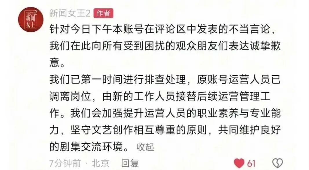 28日,有网友在《新闻女王2》官号的宣传视频下评论:“《许我耀眼》想拍出来的感觉”,获官号回复:“不是一个赛道”,引发热议。29日,《新闻女王》道歉称原账号运营人员已调离岗位,会加强提升运营人员的职业素养与专业能力。