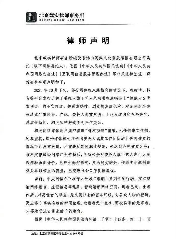 近日,范玮琪演唱会戴大S骨灰项链冲上热搜,10月28日,范瑋琪经纪公司委托律所发布律师声明:2025年10月下旬,部分媒体在未经核实的情况下,在微博、抖音等平台发布了关于委托人旗下艺人范玮琪在演唱会上“佩戴大S骨灰项链”的不实报道,并引发热搜,浏览转发超亿次。对范玮琪名誉权造成严重侵害。在此,委托人郑重声明:上述报道内容完全失实,系虚假新闻。相关项链与遗骨无任何关系。
