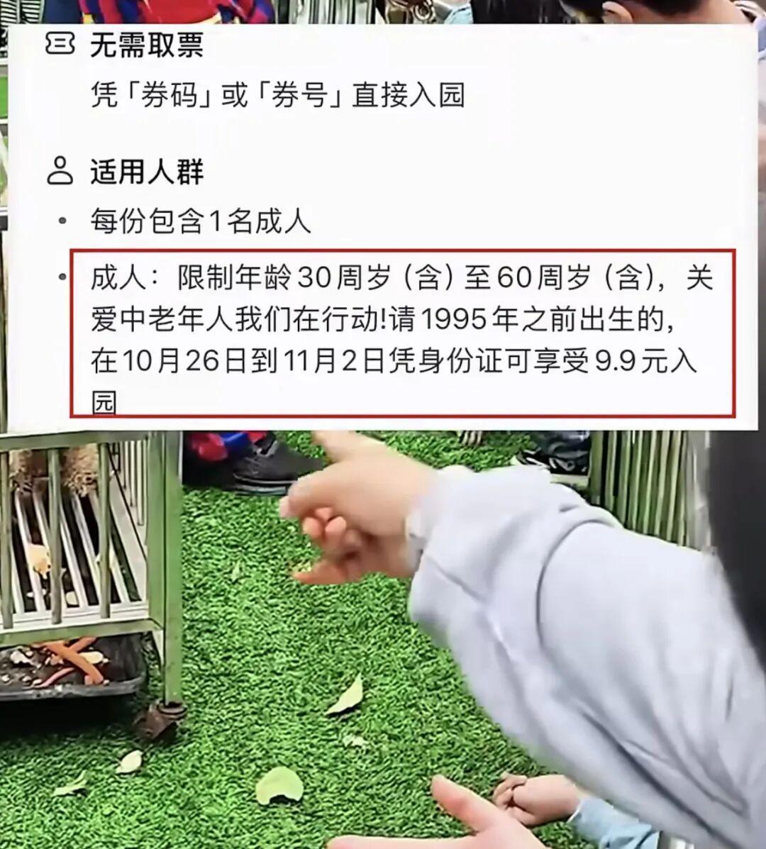 10月29日(采访),山东枣庄。有网友发视频称,山东枣庄动物园推出重阳节9.9元老年人专享票,1995年之前出生人群可以购买,调侃自己一觉醒来步入老年了。对此,动物园工作人员表示:本意是让95年之前出生的带着父母一起来可享受该票价,是为了关爱老人,可能有些网友理解错误,95年之前出生的人群也可购买,目前已下架。