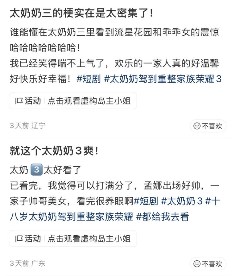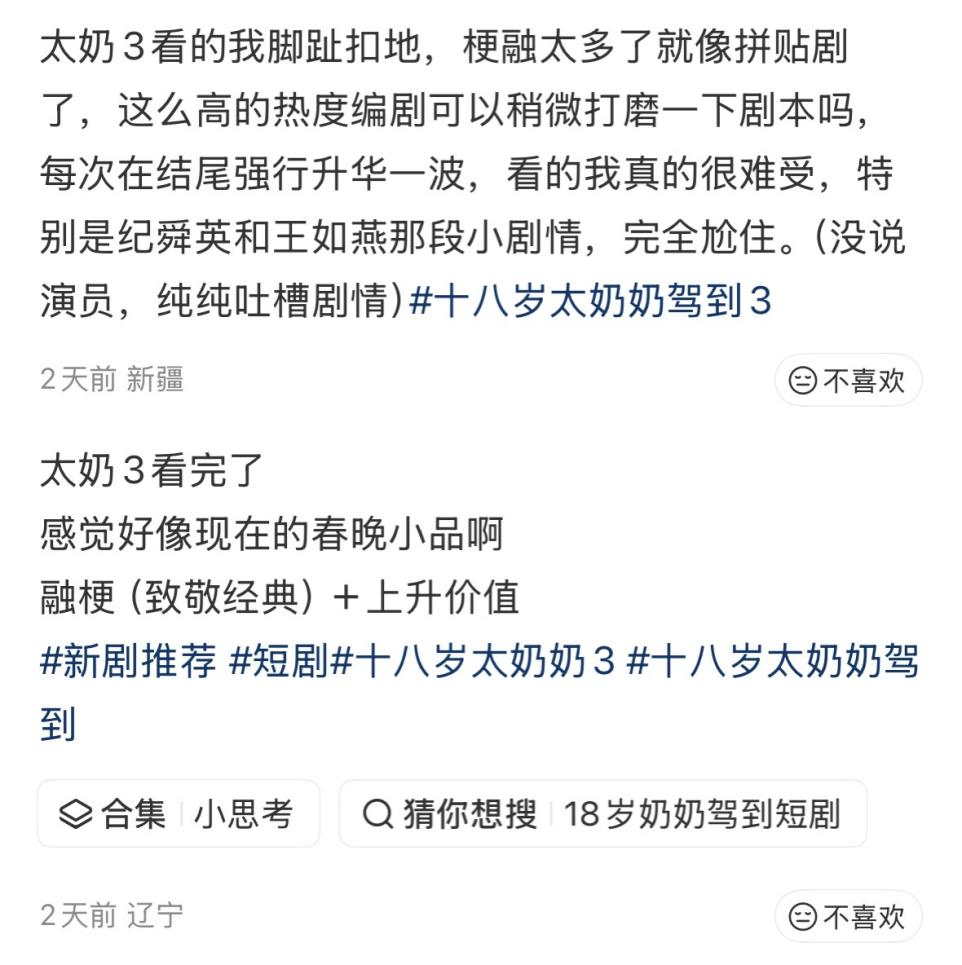 《太奶奶》的突围,本质上是对“内容为王”的坚定回归。它提醒行业:短剧若想摆脱“千剧一面”的困局,必须告别“抄经典、蹭热梗”的创作惰性,但第三季的《太奶奶》似乎也陷入了这个泥淖之中,也让评价变得参差不齐。