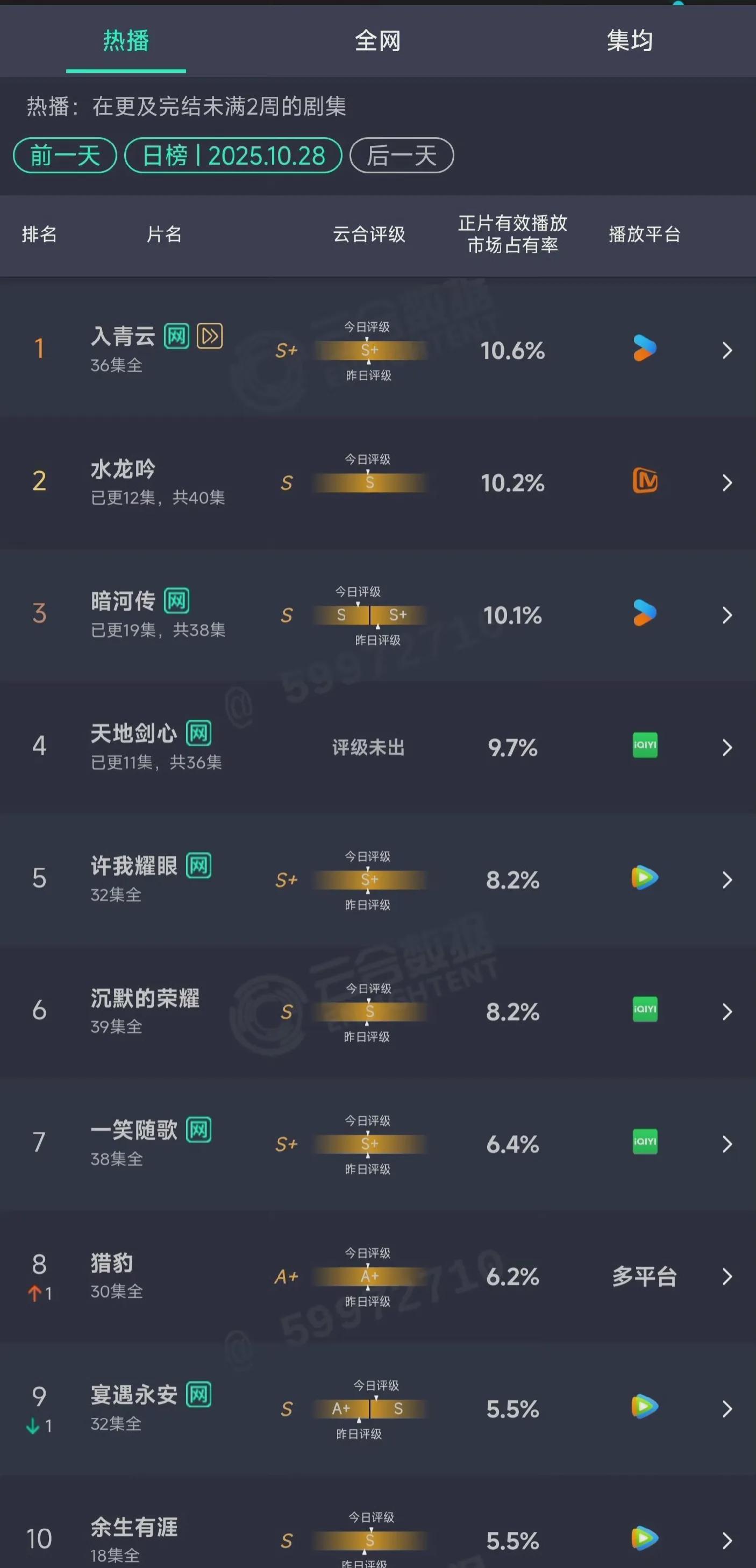 随着剧情推进,《水龙吟》热度越来越高,和排在第1的《入青云》差距非常小。要知道《水龙吟》是在芒果平台播出,平台日活低,有这个热度实属不易。酒香也怕巷子深,但凡换个平台,这部剧说不定就爆了。