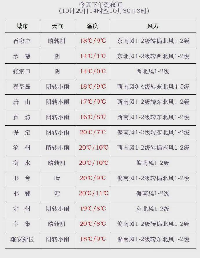 明天白天,唐山南部、秦皇岛南部及保定、廊坊以南地区多云转阴有小雨或零星小雨,其他地区晴间多云。夜间至31日,张家口北部、承德北部将出现零星小雨或雨夹雪转晴,石家庄、沧州以南地区阴有小雨或零星小雨转晴,其余地区晴间多云。