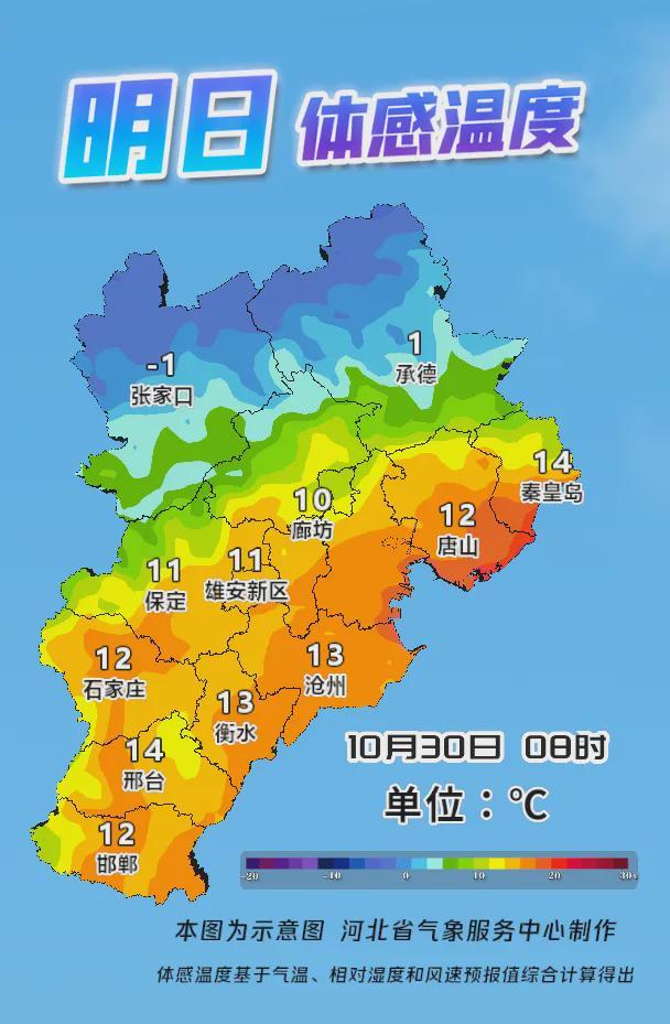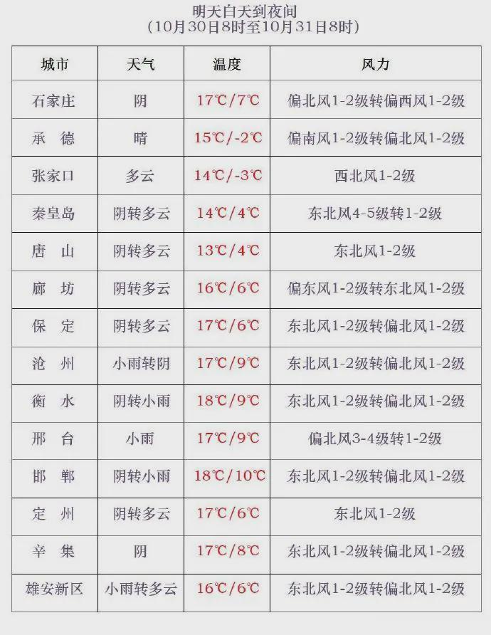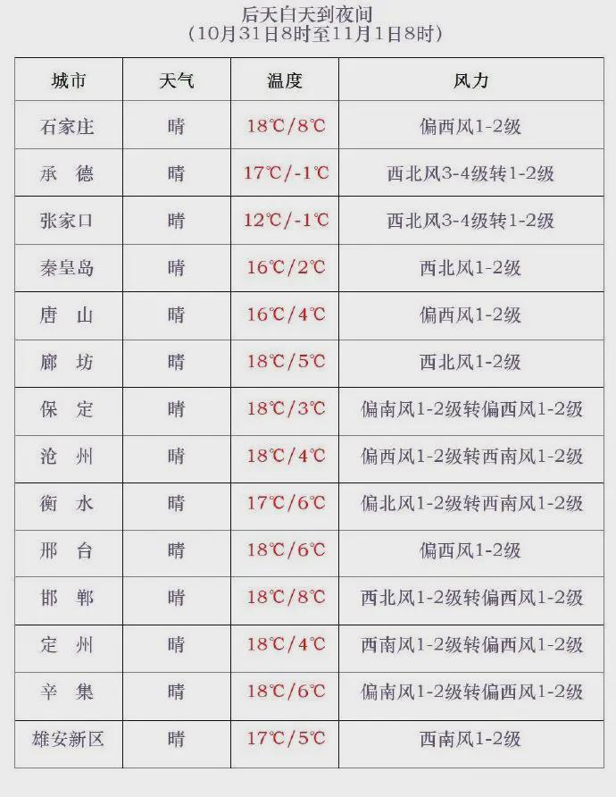 31日白天,张家口、承德、保定西部将刮起西北风4到5级,阵风6到7级,局地可达8级;11月1日白天,保定、廊坊以北地区风力持续,西北风4到5级,阵风6到7级,局地阵风8级。气温方面,30日早晨至11月1日早晨,全省大部分地区最低气温自西北向东南先后下降3~6℃,公众需注意添衣保暖。