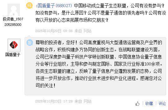 针对投资者关于中国移动成立量子生态联盟的询问,国盾量子表示,公司高度重视与大型通信运营商及产业界的战略合作,积极构建多方协同的创新生态。在战略联盟建设方面,公司已深度参与量子科技产学研创新联盟、中国信息协会量子信息分会等行业组织,并主导和参与制定国际、国家及行业标准100余项。各类生态联盟的建立,反映了量子信息产业蓬勃发展的态势,公司将进一步开放合作,推动行业技术进步和产业化进程。