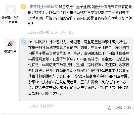针对投资者关于FPGA芯片在量子科技领域布局的询问,安路科技表示,FPGA因其高并行处理能力、低延迟、可重配置性和硬件级灵活性,在量子科技领域中有着广阔的应用前景。在量子通信中,FPGA的应用场景主要在实时信号处理与控制、密钥算法处理、网络通信处理与资源调度等。在量子计算中,FPGA的高并行、高带宽、低延迟特性使得FPGA可应用在数字波形发生器、延时校准、高速实时数字信号处理等。此外,FPGA的灵活可编程特性也使其非常适合量子通信计算的模拟与仿真应用。安路科技高度关注FPGA的前沿发展,正在开发新一代高性能FPGA芯片,未来必将广泛应用于诸多高端的应用场景之中。