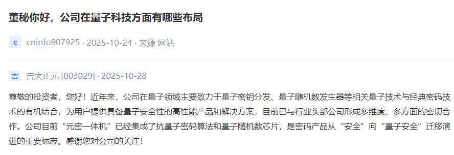 针对投资者关于公司在量子科技方面布局的询问,吉大正元表示,近年来,公司在量子领域主要致力于量子密钥分发、量子随机数发生器等相关量子技术与经典密码技术的有机结合,为用户提供具备量子安全性的高性能产品和解决方案。目前,公司已与行业头部公司形成多维度、多方面的密切合作。公司目前“元密一体机”已经集成了抗量子密码算法和量子随机数芯片,是密码产品从“安全”向“量子安全”迁移演进的重要标志。