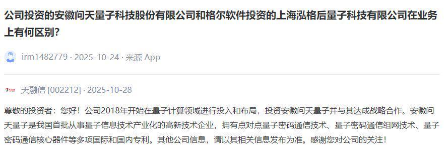 针对投资者关于公司投资的安徽问天量子科技股份有限公司业务情况的询问,天融信表示,公司2018年开始在量子计算领域进行投入和布局,投资安徽问天量子并与其达成战略合作。安徽问天量子是我国首批从事量子信息技术产业化的高新技术企业,拥有点对点量子密码通信技术、量子密码通信组网技术、量子密码通信核心器件等多项国际和国内专利。
