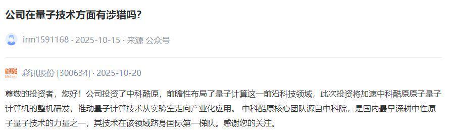 针对投资者关于公司在量子技术方面涉猎情况的询问,彩讯股份表示,公司投资了中科酷原,前瞻性布局了量子计算这一前沿科技领域。此次投资将加速中科酷原原子量子计算机的整机研发,推动量子计算技术从实验室走向产业化应用。中科酷原核心团队源自中科院,是国内最早深耕中性原子量子技术的力量之一,其技术在该领域跻身国际第一梯队。
