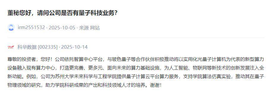 针对投资者关于公司是否有量子科技业务的询问,科华数据表示,公司依托智算中心平台,与玻色量子等合作伙伴积极推动将以实用化光量子计算机为代表的新型算力设备融入现有算力中心,打造更完善、更多元、面向未来的算力基础设施,为人工智能、物联网等新技术的创新发展注入全新动能。例如,公司为苏州大学未来科学与工程学院提供量子计算云平台算力服务,支持学院算法仿真实验,推动其在量子物理领域的研究,助力学院科研成果的产出和科技领域人才的培养。