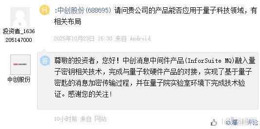 针对投资者关于公司产品能否应用于量子科技领域的询问,中创股份表示,中创消息中间件产品(InforSuite MQ)融入量子密钥相关技术,完成与量子软硬件产品的对接,实现了基于量子密匙的消息加密传输过程,并在量子院实验室环境下完成技术验证。