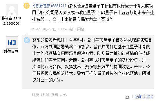 针对投资者关于公司与玻色量子合作情况的询问,纬德信息表示,今年5月,公司与玻色量子首次达成深度战略合作,双方共同签署战略合作协议,旨在共同打造基于光量子计算的电力能源领域实用型场景解决方案,以及着力推动该领域的科技成果转化和实际应用。近期,公司完成对玻色量子的参股投资,进一步深化双方合作,发挥技术、资源等多方面的协同效应。未来,公司将积极布局前沿技术,致力于推动量子科技的产业化落地。