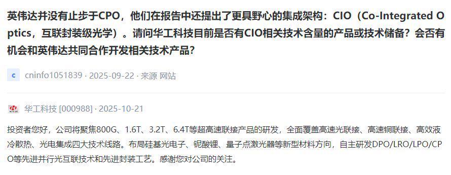 针对投资者关于公司是否有CIO相关技术含量产品或技术储备的询问,华工科技表示,公司将聚焦800G、1.6T、3.2T、6.4T等超高速联接产品的研发,全面覆盖高速光联接、高速铜联接、高效液冷散热、光电集成四大技术线路。同时,公司布局硅基光电子、铌酸锂、量子点激光器等新型材料方向,自主研发DPO/LRO/LPO/CPO等先进并行光互联技术和先进封装工艺。