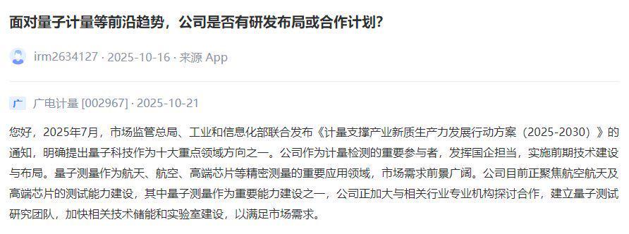 针对投资者关于公司面对量子计量等前沿趋势是否有研发布局或合作计划的询问,广电计量表示,2025年7月,市场监管总局、工业和信息化部联合发布《计量支撑产业新质生产力发展行动方案(2025-2030)》的通知,明确提出量子科技作为十大重点领域方向之一。公司作为计量检测的重要参与者,发挥国企担当,实施前期技术建设与布局。量子测量作为航天、航空、高端芯片等精密测量的重要应用领域,市场需求前景广阔。公司目前正聚焦航空航天及高端芯片的测试能力建设,其中量子测量作为重要能力建设之一,公司正加大与相关行业专业机构探讨合作,建立量子测试研究团队,加快相关技术储能和实验室建设,以满足市场需求。