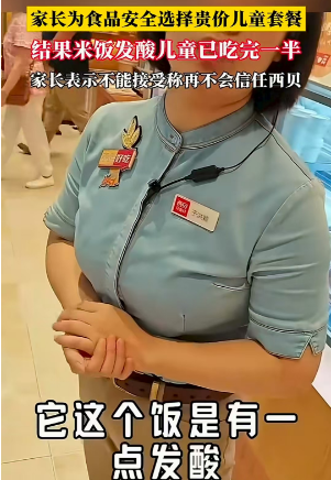 这位网友带着孩子,一家三口在西贝用餐,给孩子点的是高价的儿童套餐,结果吃到一半发现米饭是酸的,这位网友气坏了,拿起手机边拍边说: