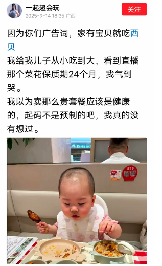 还有个网友发文说,因为你们广告词,家有宝贝就吃西贝,我给我儿子从小吃到大,看到直播那个菜花保质期24个月,我气到天。我以为卖那么贵套餐应该是健康的,起码不是预制的吧,我真的没有想过。