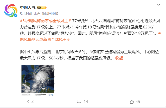 美国国家飓风中心28日称,美国东部时间当天上午10点,飓风“梅丽莎”的持续风速达到约每小时298公里,以风速计算,“梅丽莎”已成为有记录以来大西洋上第二强的飓风。