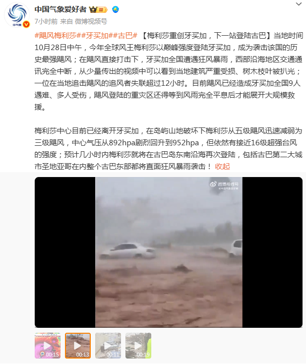 当地时间10月28日中午,今年全球风王梅利莎以巅峰强度登陆牙买加,成为袭击该国的历史最强飓风;在飓风直接打击下,牙买加全国遭遇狂风暴雨,西部沿海地区交通通讯完全中断,从少量传出的视频中可以看到当地建筑严重受损、树木枝叶被扒光;一位在当地追击飓风的追风者失联超过12小时。目前飓风已经造成牙买加全国9人遇难、多人受伤,飓风登陆的重灾区还得等到风雨完全平息后才能展开大规模救援。