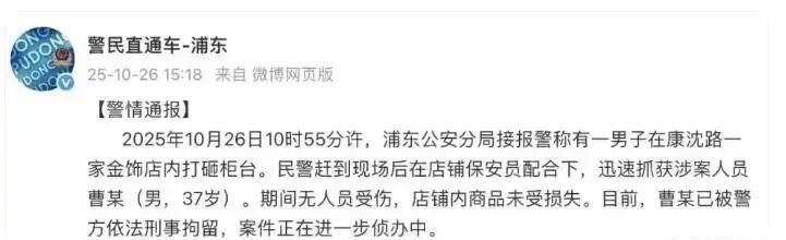 涉事男子姓曹,37岁,无业状态。这个年纪本应是家庭顶梁柱,但他却陷入“上有老下有小”却无收入来源的困境。当他在金店举起锤子的那一刻,砸碎的不仅是玻璃柜,更是一个中年男人对生活的最后挣扎。有网友评论:“他选错了门,但或许这是他唯一能想到的‘出路’。”