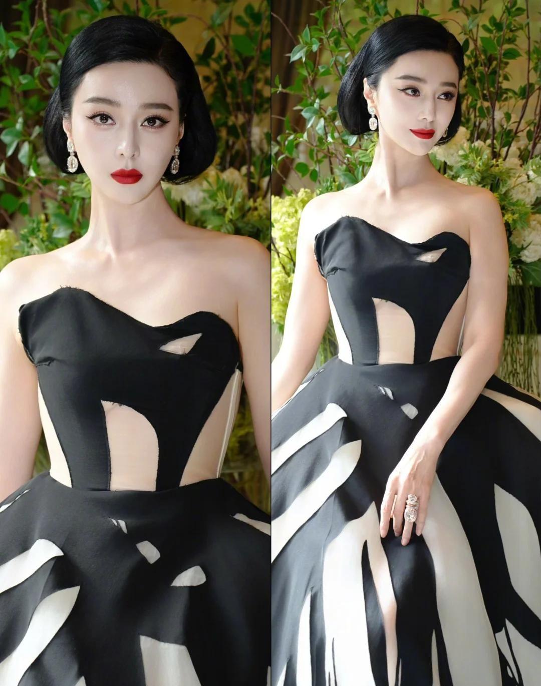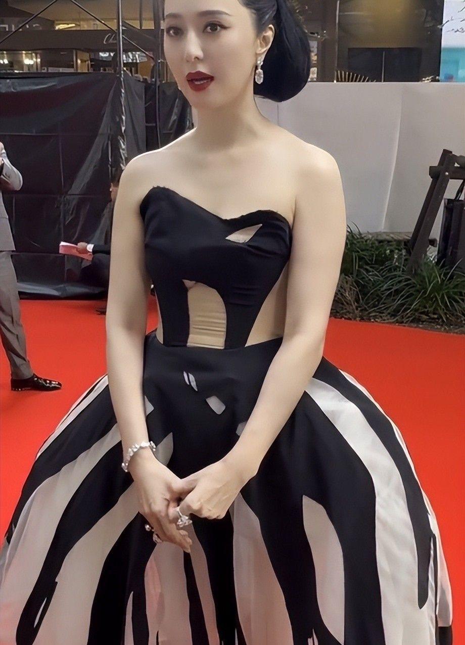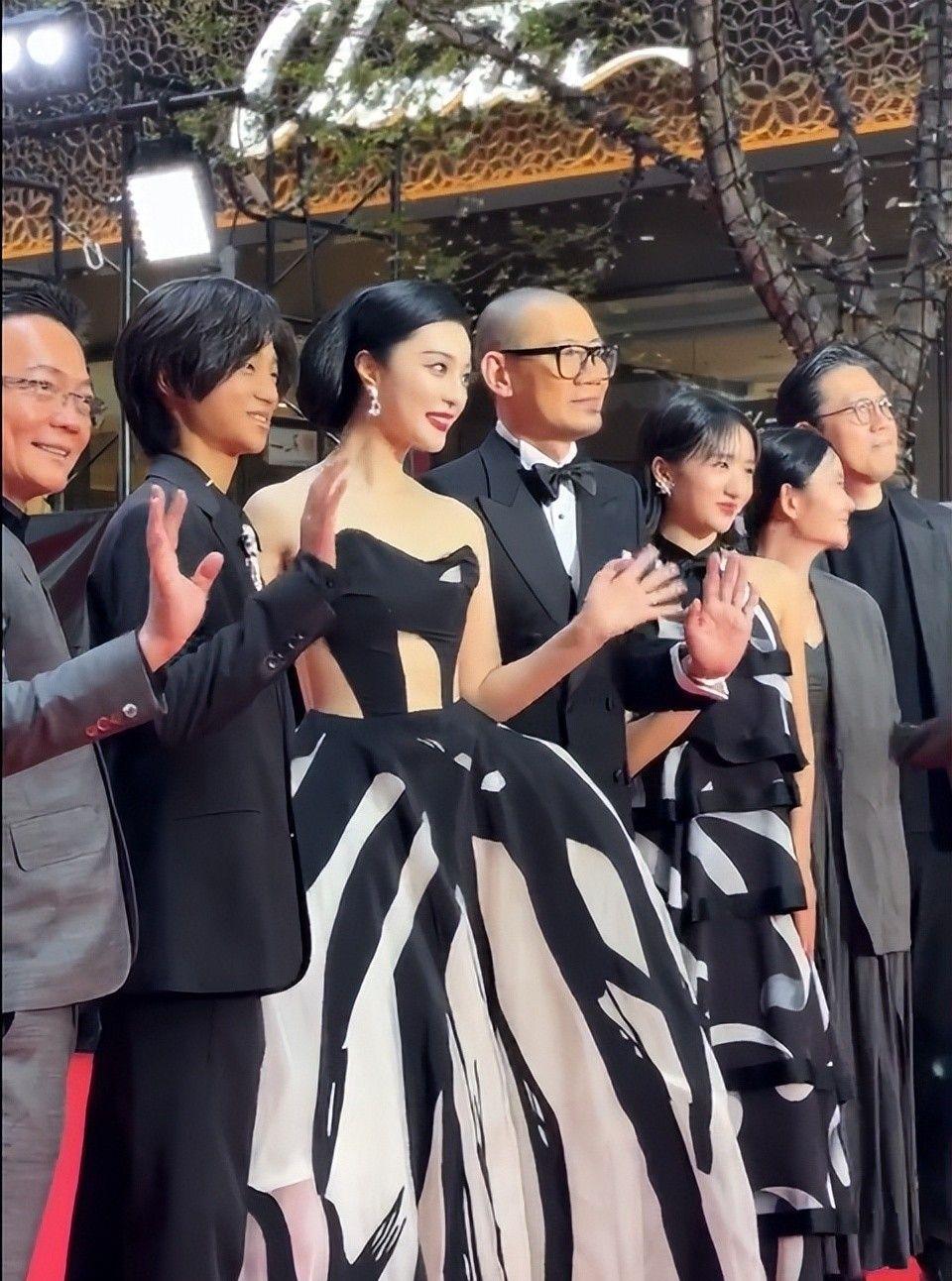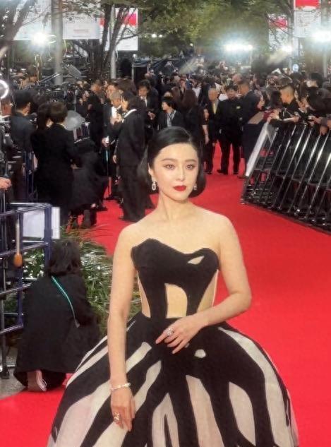 范冰冰穿着一袭黑色抹胸搭配黑白条纹大裙摆的礼服走上红毯,日本媒体的相机快门声竟然盖过了现场音乐。