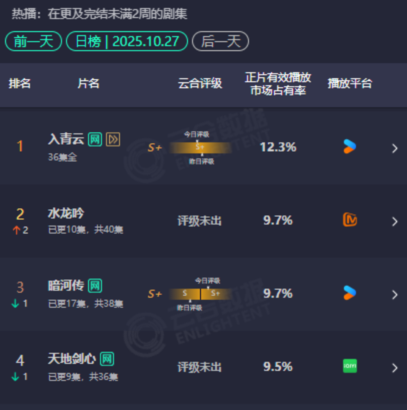 龚俊、罗云熙、成毅三大流量明星同题材对决,本是第四季度剧集市场的最大看点,承载着带动长剧回暖的厚望。然而,结果却令人大跌眼镜,三部男频大剧均未能突破云合正片有效播放量市占率的两位数大关,市场讨论也主要集中在“哪部剧扑得更惨”上。即便是暂时领先的《水龙吟》,也未能展现出明显的优势。