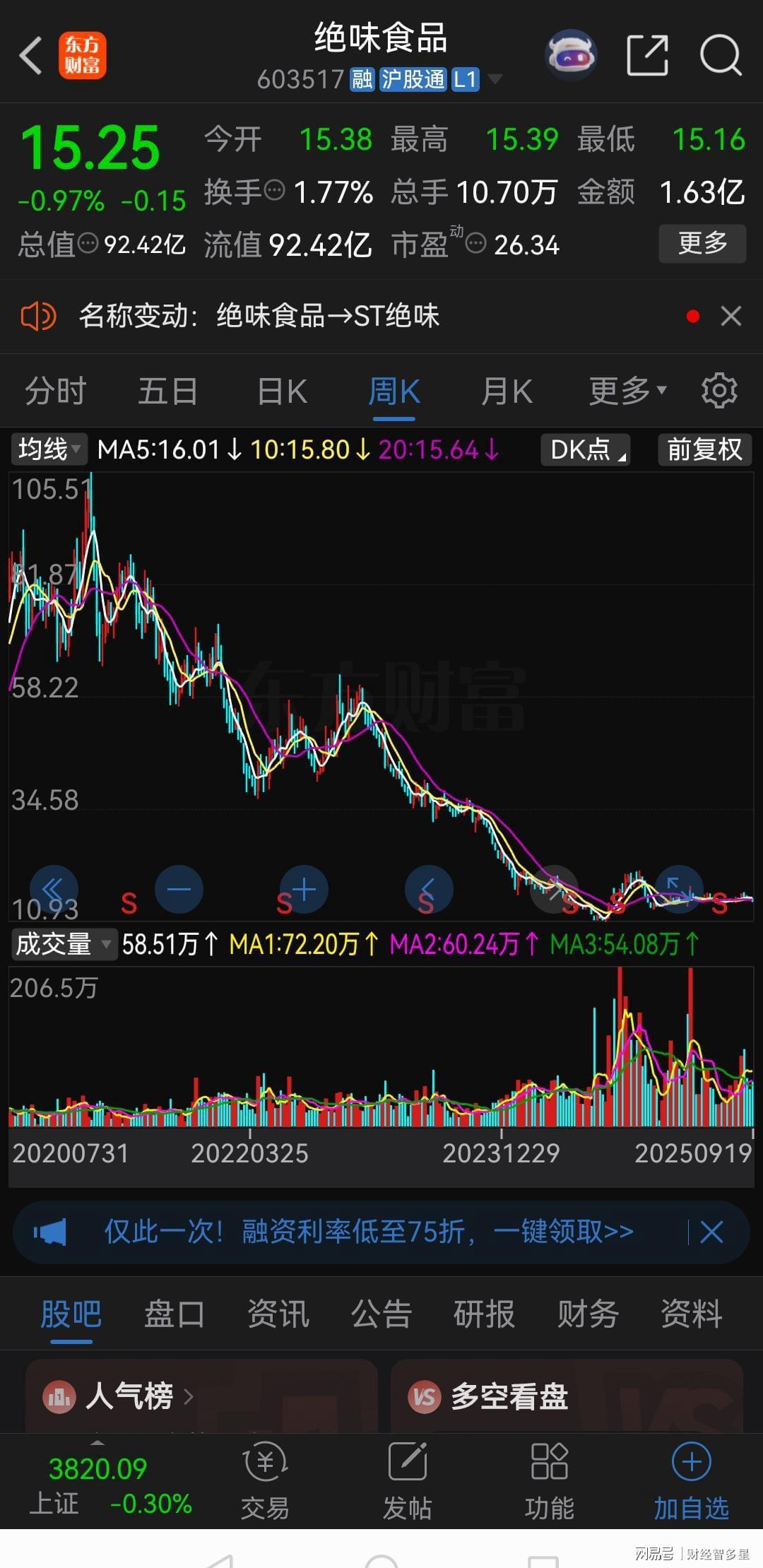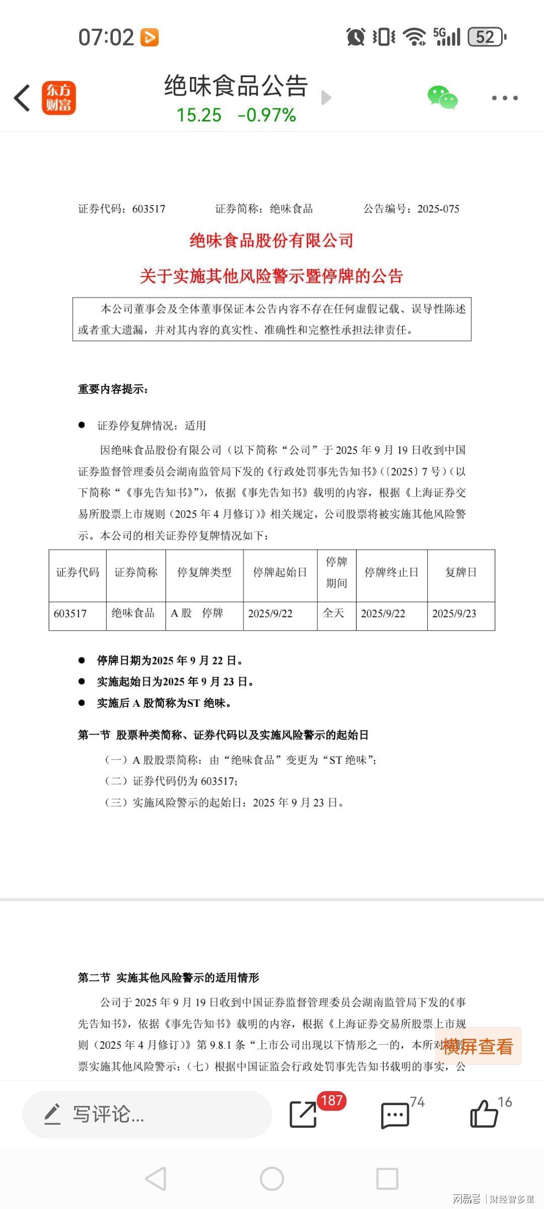 9月19日晚间,绝味食品收到中国证监会湖南证监局下发的相关文书,公司股票将被实施其他风险警示。股票将于2025年9月22日停牌1天,9月23日起实施其他风险警示,股票简称变更为“ST绝味”。这一消息无疑给已经饱受股价下跌之苦的股东们又一记重击。